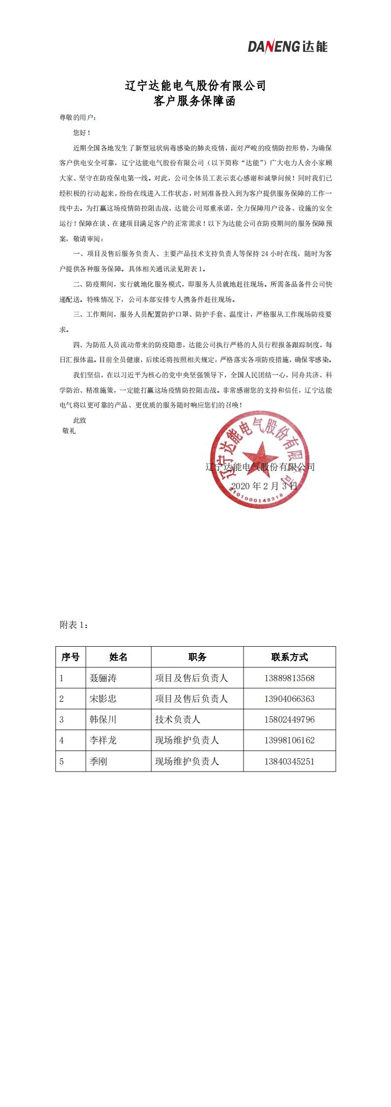 Customer service guarantee letter of Liaoning Daneng Electric Co., Ltd