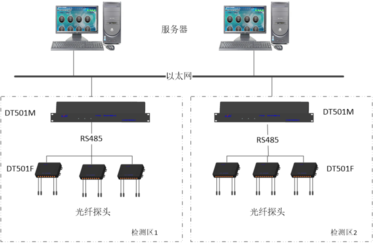 荧光光纤测温系统由荧光光纤温度解调仪(DT-501F)、光纤传感探头(DT-S100)、荧光光纤测温主机(DT-501M)和系统管理软件4部分组成。其中:光纤传感探头(DT-S100)将检测位置的温度信息转换成光信号;荧光光纤温度解调仪(DT-501F)实时接收光纤传感探头送来的携带温度信息的光信号,将其解调成温度值,实现对被检测部位温度测量;荧光光纤测温主机(DT-501M)通过RS485总线方式连接多个荧光光纤温度解调仪,将温度信息、超温报警信息以及系统状态信息进行数据汇总,通过以太网传输到系统管理软件;系统管理软件控制和显示相关的温度以及数据变化。
