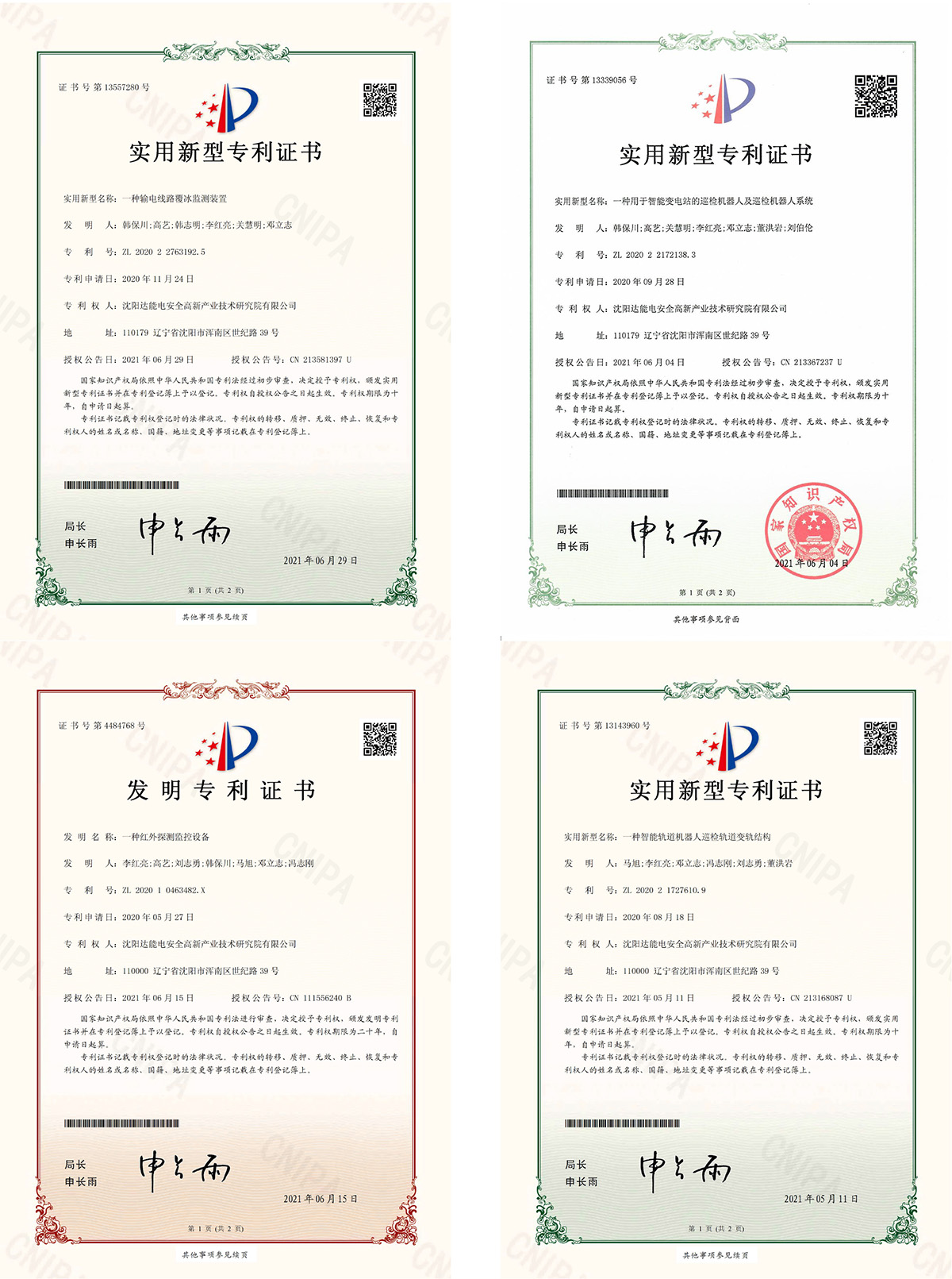 实用新型专利包括:《一种用于智能变电站的巡检机器人及巡检机器人系统》、《一种输电线路覆冰监测装置》、《一种智能轨道机器人巡检轨道变轨结构》,发明专利为《一种红外探测监控设备》。
