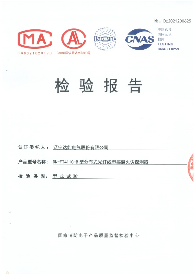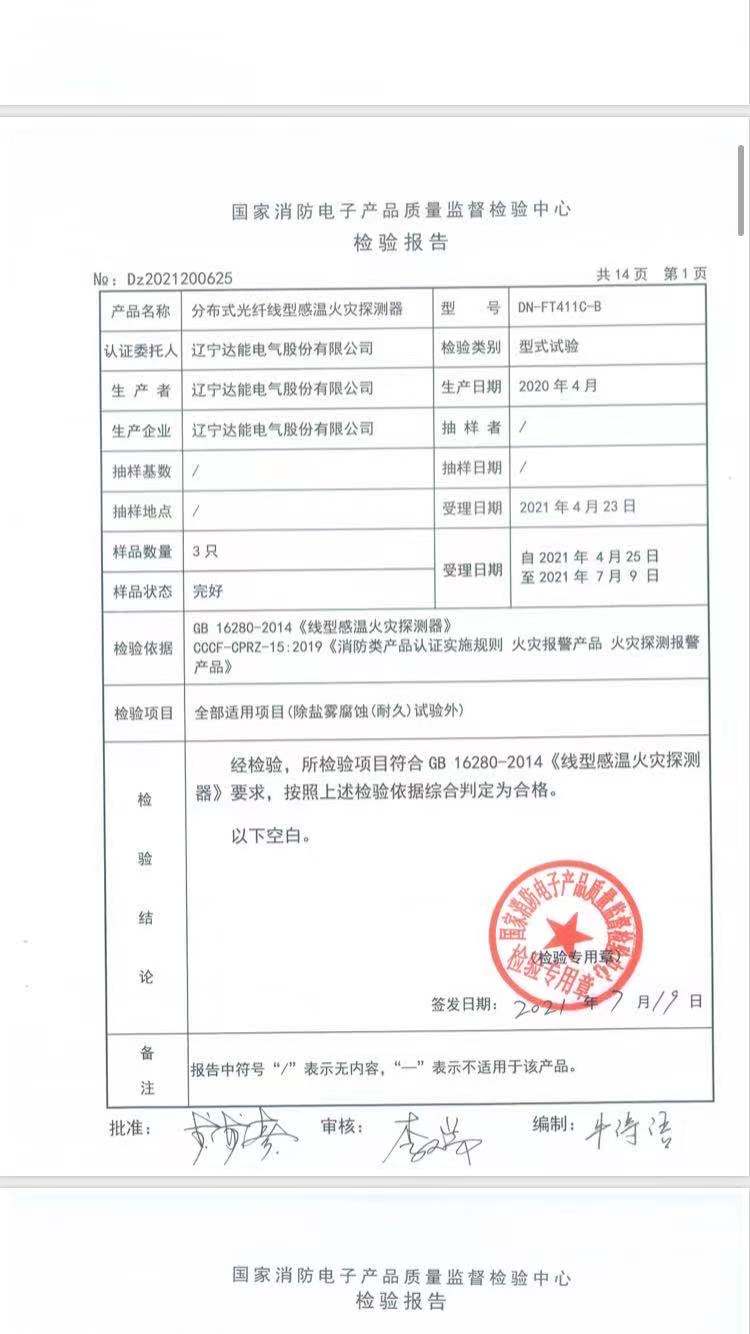 近日,QM球盟会电气集团旗下产品—《DN-FT411C-B型分布式光纤型感温火灾探测器》通过国家“国家消防电子产品质量监督检验中心”检测并取得检验报告,标志着公司核心产品质量满足国家检测条件,达到行业高标准水平,产品检验项目符合相关标准要求。