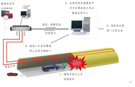 隧道是封闭的狭长空间,交通量大,通风条件差,发生火灾后烟气大而且不易散发, 容易对洞内车辆、人员和设备安全构成重大危害。光纤传感系统可以准确地探测到隧道全长范围内的温度分布情况,对隧道内的温度进行实时、长期的监测,并利用经验值根据温度情况做出合理判断,在火灾发生之前对发展情况进行掌控。当有事故和火灾发生时迅速发出警报,阻止后来车辆进入隧道,将事故损失降至最低。