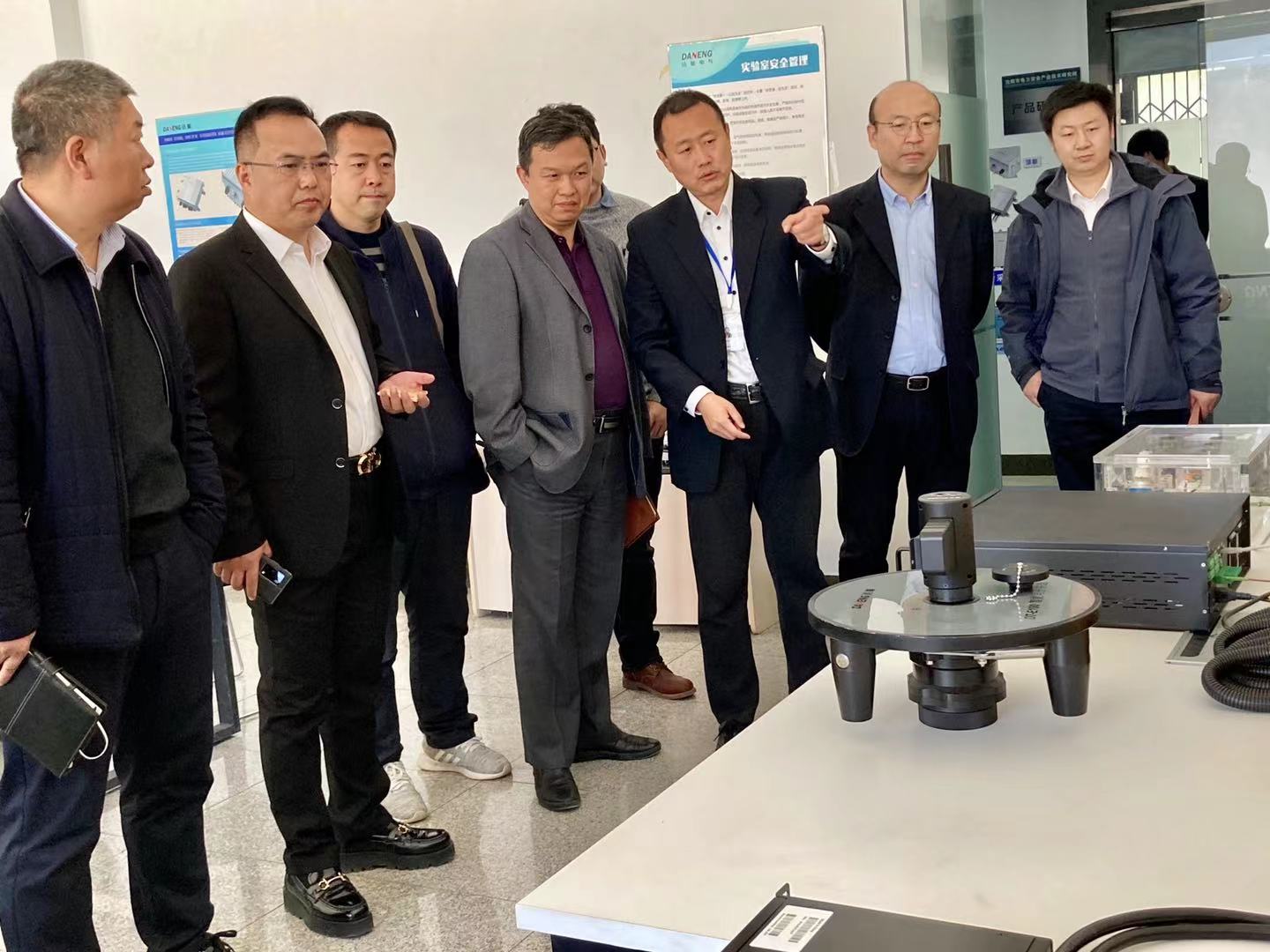 QM球盟会电气董事长高艺、总裁关慧明、资本总裁李顺及各部门负责人陪同客人参观QM球盟会电安全产业技术研究院各研发室及产品测试区,实地考察研发、生产一线。高总向客人详细介绍了智能电子井盖、分布式光纤测试系统、智能环流接地箱等核心产品。QM球盟会电安全产业技术研究院QM球盟会电气全资子公司,是专注于电力安全产业技术研究的研发机构,研究院自成立以来立足电力安全前沿技术,充分发挥科研实力,深入开展产学研互动,推动科技成果持续转化,为区域输变配电安全发展贡献力量。