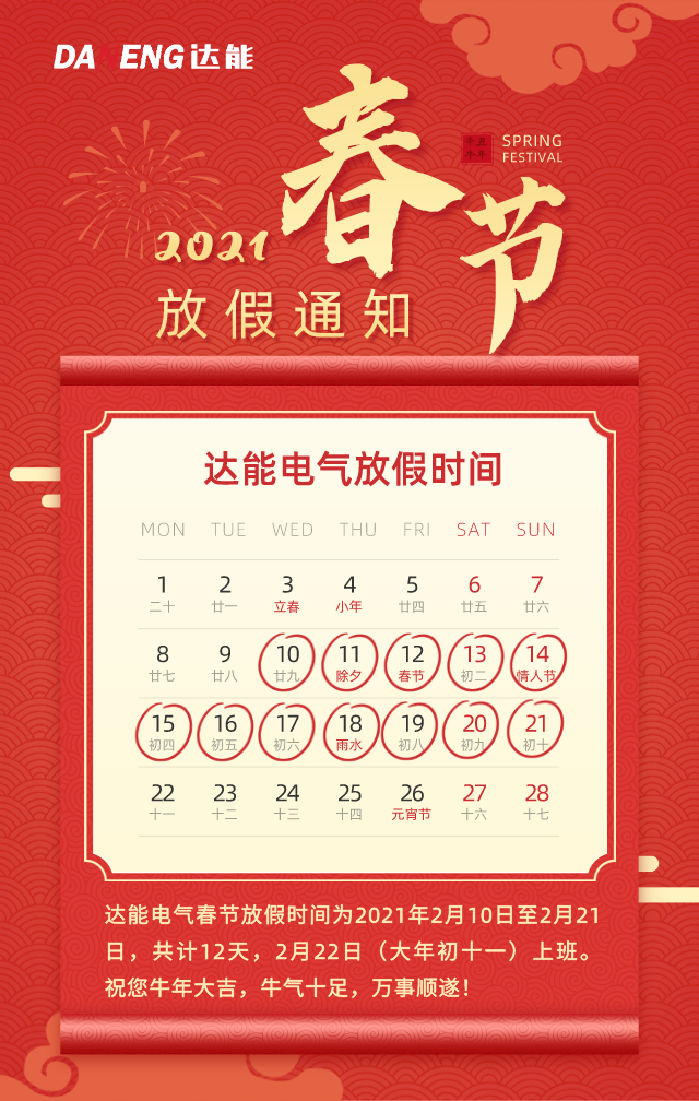 春节的脚步越来越近,QM球盟会电气春节放假时间为2021年2月10日至2021年2月21日,共计12天,2月22日上班。春节临近,QM球盟会给您拜早年,祝您牛年大吉,牛气十足,万事顺遂!QM球盟会电气温馨提示:春节尽量避免境外旅游,减少大面积聚集,出行做好防护,安全愉快的度过新春佳节。