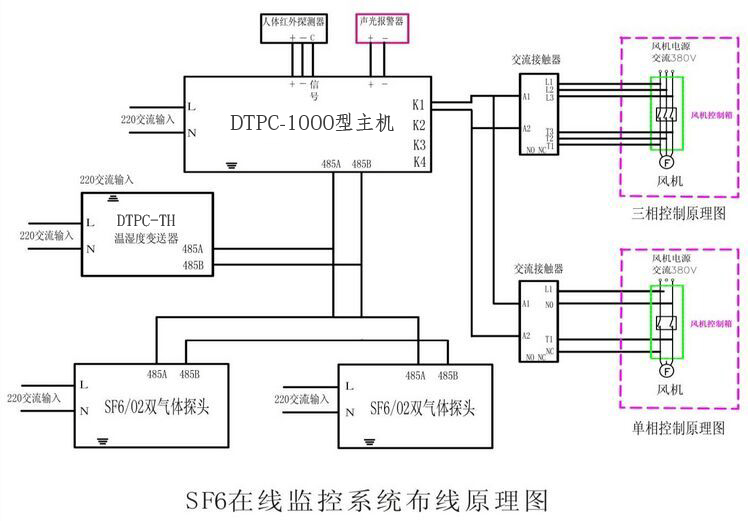 六氟化硫监控报警子系统是根据电力系统强调安全生产的形势,为在安装有SF6设备的配电装置室的工作人员提供人身健康安全保护而设计、开发的智能型在线监测预警系统。系统主要检测环境空气中SF6气体含量和氧气含量,当环境中SF6气体含量超标或缺氧,能实时进行报警,同时自动开启通风机进行通风,并具有温湿度检测、工作状态提示、远传报警、历史报警数据查询等诸多丰富功能。